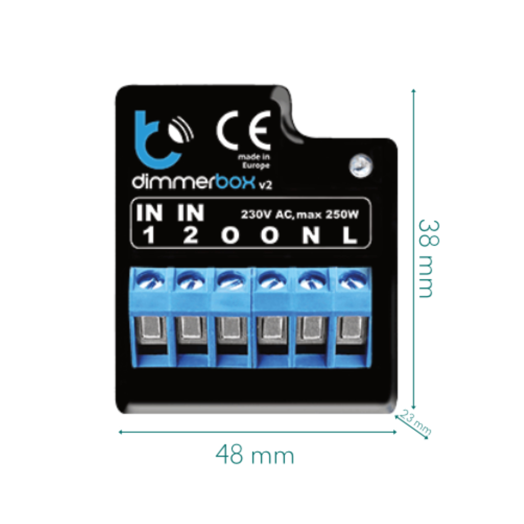 Regulador de fluxo luminoso para lâmpadas de halogéneo e iluminação led 230V. Controlar a intensidade da iluminação através do smartphone, suficientemente pequeno para instalar num candeeiro de mesa. Controla quase todos os tipos de luz regulável e pode ser ligado a um interrutor de parede normal. Oferece uma melhor proteção para a suas iluminação.